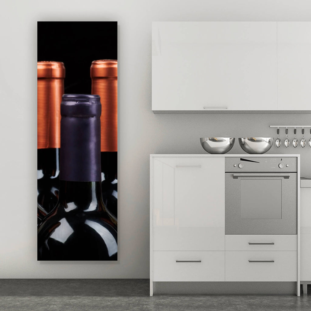 Das Spannrahmenbild Edle Weinflaschen im Panorama Hoch gehört mit großem Abstand zu den edelsten Wandbildvarianten. Textilspannrahmen, oft auch Frameless, Aluframes oder Textilspannrahmen genannt, sind die perfekte Kombination aus einem 25 mm starken eloxiertem Aluminiumrahmen und einem hochwertigen Sublimationsdruck auf einem Textil Banner. Der leichte Alurahmen, das Textilbanner mit Gummilippe und eine Aufhängung gibt es bei uns im praktischen Komplettset. Spannbilder sind eine großartige Alternative zu allen anderen Wandbild Arten und vermitteln eine luxuriöse und anmutende Ausstrahlung. Auch ein kurzfristiger Motivwechsel ist mit einem Spannrahmenbild kein Problem mehr, da die Drucke einfach austauschbar sind. Da sich der Rahmen ja dann bereits im Besitz befindet, kann einfach ein passender Ersatzdruck kostengünstig nachbestellt werden, selbstverständlich auch mit einem anderen Motiv. Im Handumdrehen erstrahlt die Wand in neuem Glanz. Der Textildruck ist B1 zertifiziert und somit auch ideal für Gewerbe, Büro oder Praxis. Spannrahmenbilder, die auch nach Jahren noch wie neu aussehen und strahlen.