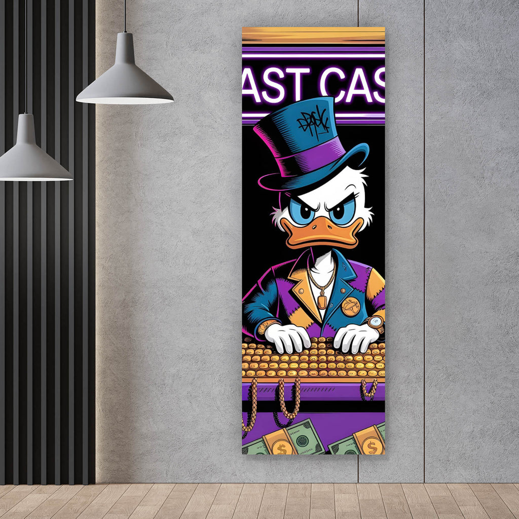 Dieses eindrucksvolle Wandbild zeigt ein charakteristisches Entenmotiv, das in einer modernen und pop-artigen Stilrichtung gestaltet ist. Die Ente, gekleidet in einem stilvollen Anzug mit Zylinder, sitzt vor einem Tisch voller Münzen, was einen starken Bezug zu Themen wie Reichtum und Investition herstellt. Umgeben von Geldsymbolen und Spielkarten entsteht eine spielerische, humorvolle Atmosphäre, die gleichzeitig Luxus und Kreativität ausstrahlt. Die Komposition ist dynamisch, mit klaren Linien und einem harmonischen Aufbau, der die Blicke auf sich zieht und jedes Zimmer, ob Wohnzimmer, Büro oder Hobbyraum, bereichert. Das Bild vermittelt eine Botschaft von Wohlstand und Erfolg und dient als ausdrucksstarkes Statement-Piece. Die künstlerische Umsetzung im Cartoon-Stil verleiht der Darstellung einen humorvollen Touch, der sowohl Sammler als auch Kunstliebhaber anspricht. Die moderne Materialanmutung und die lebendige Darstellung sorgen für eine intensive Raumwirkung, die eine inspirierende und zugleich unterhaltsame Stimmung schafft. Dieses Wandbild ist perfekt für alle, die nach einem einzigartigen und kreativen Dekorationselement suchen, das gleichzeitig Stil und Persönlichkeit vermittelt.