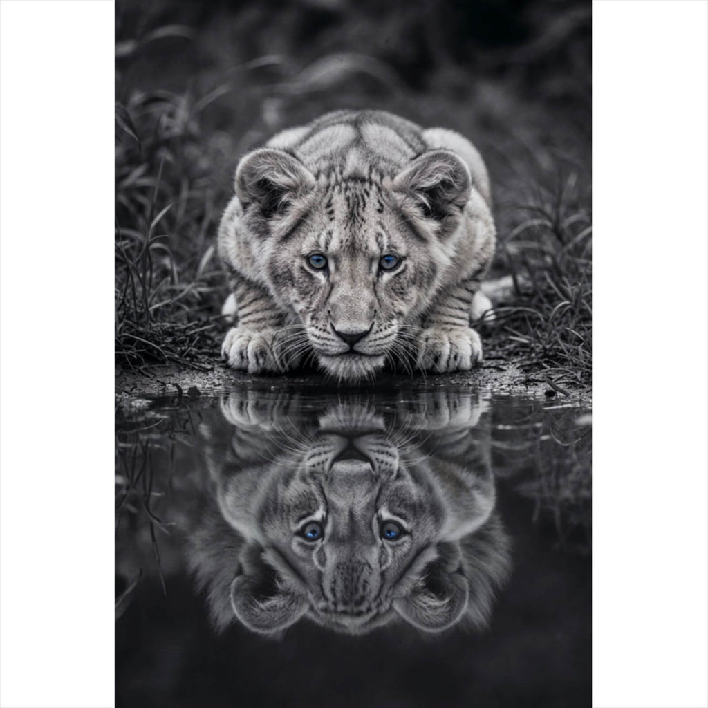 Das eindrucksvolle Wandbild zeigt ein Löwenjunges, das sich über einen spiegelglatten Wasseroberfläche beugt und sein eigenes Spiegelbild betrachtet. Diese Komposition schafft eine faszinierende Symmetrie und zieht den Betrachter in die Tiefe der Szene hinein. Das Motiv besticht durch seine Detailtreue und die eindrucksvolle Darstellung der Wildnis. Die ruhige, fast meditative Atmosphäre des Bildes vermittelt ein Gefühl von Gelassenheit und natürlicher Schönheit. Der Stil des Bildes ist modern und künstlerisch, was es zu einem idealen Dekorationsstück für zeitgenössische Wohnräume macht. Die präzise Fotografie und die harmonische Balance zwischen Motiv und Hintergrund erzeugen eine visuelle Spannung, die das Bild zu einem echten Blickfang macht. Dieses Kunstwerk eignet sich hervorragend, um in Wohnzimmern, Büros oder Schlafzimmern eine exklusive und inspirierende Atmosphäre zu schaffen. Die Reflexion im Wasser verstärkt die ästhetische Wirkung und lädt den Betrachter dazu ein, über die Verbindung von Natur und Kunst nachzudenken. Ein Muss für Liebhaber moderner Wanddekorationen, die einen Hauch von Wildnis und Eleganz in ihr Zuhause bringen möchten.