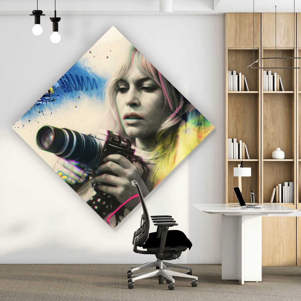 Das Spannrahmenbild Französische Film Ikone im Graffiti Stil als Raute gehört mit großem Abstand zu den edelsten Wandbildvarianten. Textilspannrahmen, oft auch Frameless, Aluframes oder Textilspannrahmen genannt, sind die perfekte Kombination aus einem 25 mm starken eloxiertem Aluminiumrahmen und einem hochwertigen Sublimationsdruck auf einem Textil Banner. Der leichte Alurahmen, das Textilbanner mit Gummilippe und eine Aufhängung gibt es bei uns im praktischen Komplettset. Spannbilder sind eine großartige Alternative zu allen anderen Wandbild Arten und vermitteln eine luxuriöse und anmutende Ausstrahlung. Auch ein kurzfristiger Motivwechsel ist mit einem Spannrahmenbild kein Problem mehr, da die Drucke einfach austauschbar sind. Da sich der Rahmen ja dann bereits im Besitz befindet, kann einfach ein passender Ersatzdruck kostengünstig nachbestellt werden, selbstverständlich auch mit einem anderen Motiv. Im Handumdrehen erstrahlt die Wand in neuem Glanz. Der Textildruck ist B1 zertifiziert und somit auch ideal für Gewerbe, Büro oder Praxis. Spannrahmenbilder, die auch nach Jahren noch wie neu aussehen und strahlen.