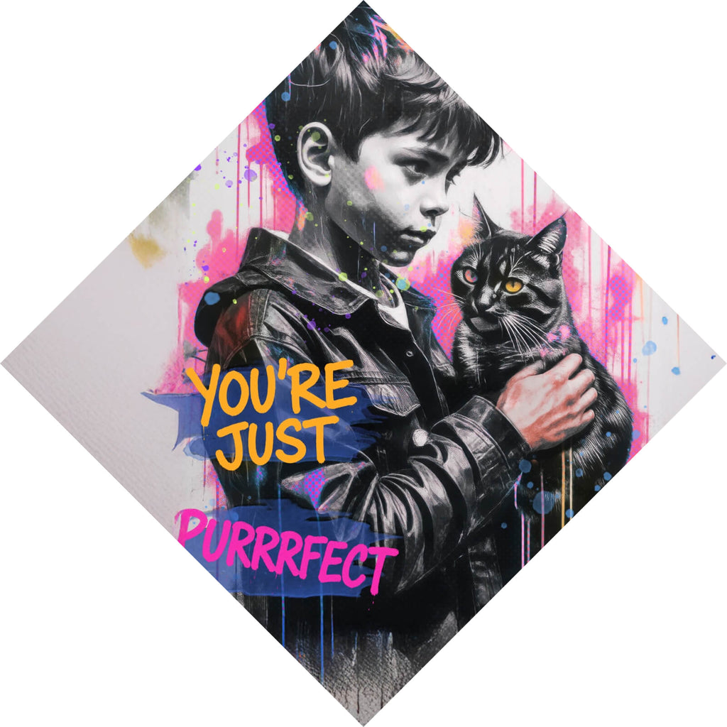 Das Bild zeigt ein ausdrucksstarkes Graffiti-Kunstwerk, das einen jungen Jungen darstellt, der liebevoll eine Katze hält. Die Szenerie ist in einem urbanen, modernen Stil gehalten, der durch lebendige Sprühfarben zum Leben erweckt wird. Der Hintergrund ist eine Explosion aus Farben, hauptsächlich in Pink, Gelb und Blau, die in dynamischen Tropfen und Spritzern gestaltet sind. Diese bunten Akzente kontrastieren stark mit dem schwarz-grauen Portrait des Jungen und der Katze, wodurch ein beeindruckender visueller Effekt entsteht. Die Worte "You're just purrrfect" sind in kräftigen gelben und pinken Buchstaben geschrieben und verleihen dem Bild eine spielerische Note. Der Junge trägt eine Jacke, und sein Blick ist liebevoll auf die Katze gerichtet, die aufmerksam in die Ferne schaut. Diese Darstellung fängt die Essenz von Freundschaft und Zuneigung ein und kombiniert sie mit einer künstlerischen, urbanen Ästhetik, die sowohl modern als auch zeitlos wirkt. Das Zusammenspiel von Farben und der lebendige Ausdruck der Figuren machen dieses Bild zu einem bemerkenswerten Beispiel für zeitgenössische Street Art.