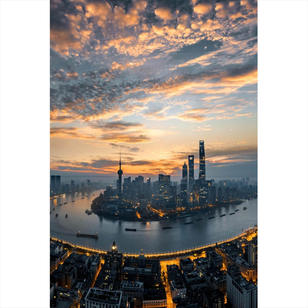 Das Bild zeigt eine beeindruckende moderne Stadtlandschaft, die durch ihre imposante Skyline und das weite Panorama besticht. Die dynamische Anordnung der Hochhäuser und Wolkenkratzer schafft eine beeindruckende Silhouette am Horizont. Diese städtische Metropole präsentiert sich in voller Pracht, wobei die Beleuchtung der Gebäude bei Dämmerung ein faszinierendes Spiel von Licht und Schatten erzeugt. Die Perspektive aus der Vogelperspektive verleiht dem Betrachter das Gefühl, über die Stadt zu schweben, und eröffnet eine umfassende Aussicht auf die urbane Dynamik. Der Fluss, der sich durch die Stadt schlängelt, fügt eine natürliche Komponente hinzu und betont die harmonische Verbindung von Natur und Architektur. Die Konturen der Stadt zeichnen sich klar gegen den Horizont ab, unterstrichen von der subtilen Beleuchtung, die die architektonischen Details hervorhebt. Diese Darstellung einer modernen Metropole ist ideal für Liebhaber von Urbanität und Architektur, die die Energie und das Leben der Stadt in ihren Wohn- oder Arbeitsräumen integrieren möchten. Das Bild vermittelt eine Stimmung von Fortschritt und Innovation, während es gleichzeitig eine beruhigende Atmosphäre durch die weite Perspektive und die harmonische Anordnung der Elemente schafft.