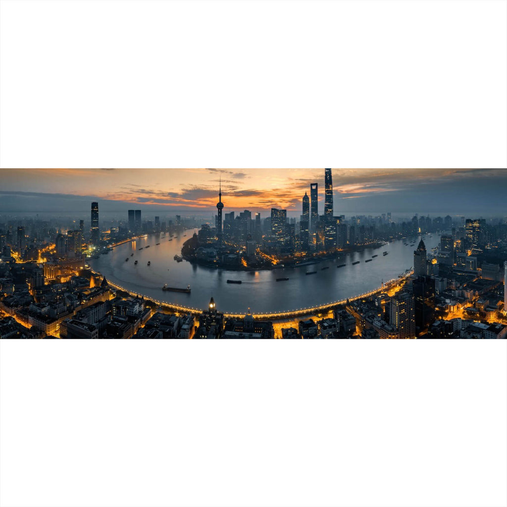 Das Bild zeigt eine beeindruckende moderne Stadtlandschaft, die durch ihre imposante Skyline und das weite Panorama besticht. Die dynamische Anordnung der Hochhäuser und Wolkenkratzer schafft eine beeindruckende Silhouette am Horizont. Diese städtische Metropole präsentiert sich in voller Pracht, wobei die Beleuchtung der Gebäude bei Dämmerung ein faszinierendes Spiel von Licht und Schatten erzeugt. Die Perspektive aus der Vogelperspektive verleiht dem Betrachter das Gefühl, über die Stadt zu schweben, und eröffnet eine umfassende Aussicht auf die urbane Dynamik. Der Fluss, der sich durch die Stadt schlängelt, fügt eine natürliche Komponente hinzu und betont die harmonische Verbindung von Natur und Architektur. Die Konturen der Stadt zeichnen sich klar gegen den Horizont ab, unterstrichen von der subtilen Beleuchtung, die die architektonischen Details hervorhebt. Diese Darstellung einer modernen Metropole ist ideal für Liebhaber von Urbanität und Architektur, die die Energie und das Leben der Stadt in ihren Wohn- oder Arbeitsräumen integrieren möchten. Das Bild vermittelt eine Stimmung von Fortschritt und Innovation, während es gleichzeitig eine beruhigende Atmosphäre durch die weite Perspektive und die harmonische Anordnung der Elemente schafft.