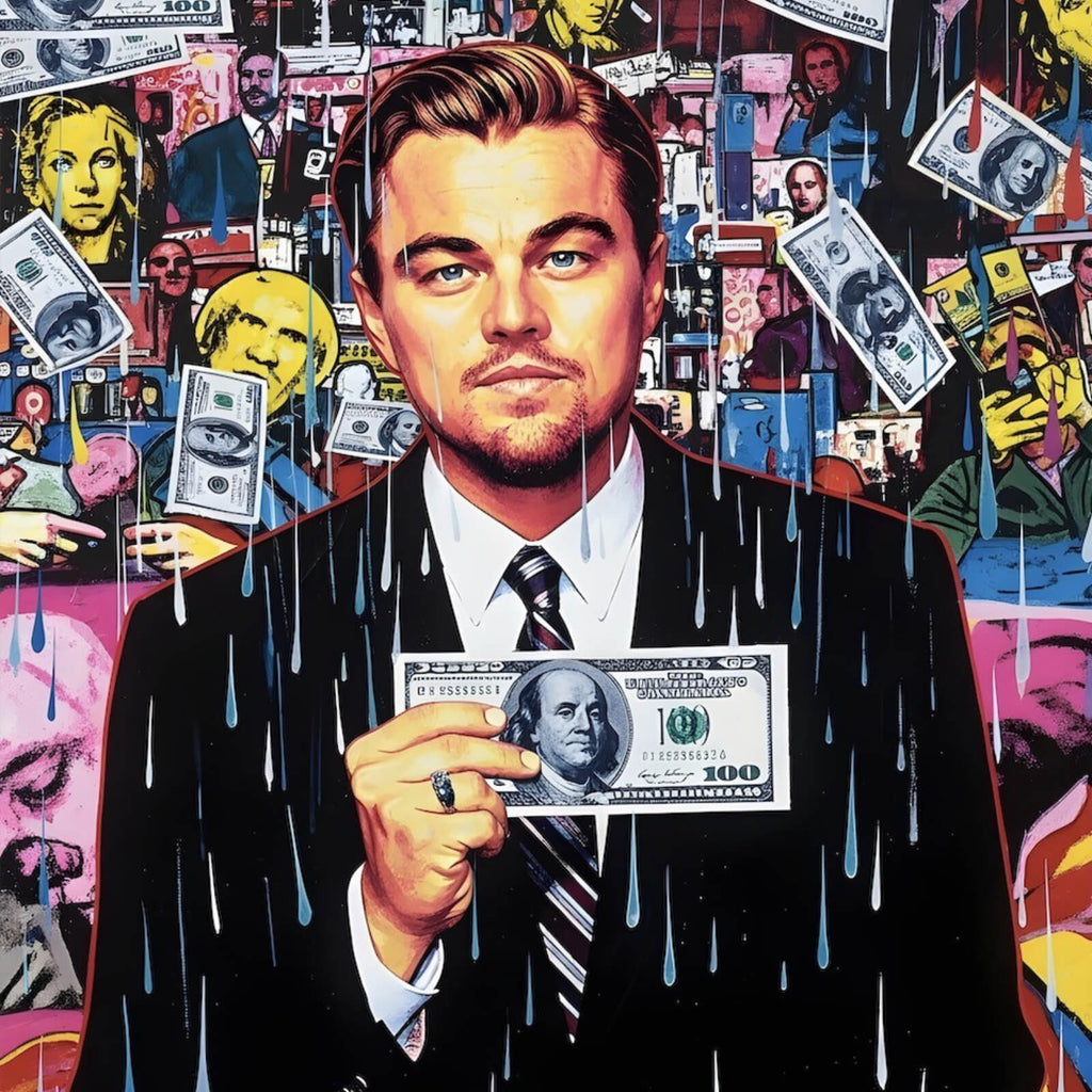 Das Bild zeigt einen Mann in einem schwarzen Anzug mit Krawatte, der einen 100-Dollar-Schein in den Händen hält. Der Hintergrund ist eine lebendige Collage aus verschiedenen Pop-Art-Elementen und Bildern, die in kräftigen Farben wie Blau, Rot und Gelb gestaltet sind. Über dem gesamten Bild scheinen Dollar-Scheine in unterschiedlichen Ausrichtungen und Größen herabzufallen, was einen dynamischen und fast surrealen Effekt erzeugt. Der Mann wirkt konzentriert und selbstbewusst, als würde er die Bedeutung des Geldes und dessen Einfluss symbolisieren. Die verschiedenen Gesichter und Figuren im Hintergrund könnten auf unterschiedliche Persönlichkeiten oder historische Figuren hinweisen, die einen Einfluss auf den gesellschaftlichen oder wirtschaftlichen Kontext haben. Die Tropfen, die über das Bild verteilt sind, verleihen dem Kunstwerk eine zusätzliche Dimension, die an Regen erinnern könnte, was möglicherweise eine Metapher für den unaufhörlichen Fluss von Geld und Macht darstellt. Insgesamt vermittelt das Bild eine starke visuelle Botschaft über Reichtum, Konsum und den Einfluss von Geld in der modernen Welt, alles verpackt in einem auffälligen, künstlerischen Stil.