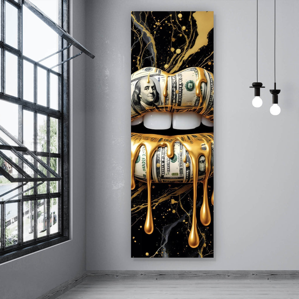 Dieses beeindruckende Wandbild zeigt ein faszinierendes Motiv, das Luxus und Kreativität in einem einzigartigen Kunstwerk vereint. Die zentrale Darstellung der Lippen, die aus Geldscheinen geformt sind, wird durch fließende goldene Akzente ergänzt, die dem Bild eine außergewöhnliche Tiefe und Dynamik verleihen. Die Kombination aus modernen und opulenten Elementen zieht den Betrachter in ihren Bann und vermittelt ein Gefühl von Glamour und Stil. Die kunstvoll arrangierten Details erzeugen eine eindrucksvolle Raumwirkung und machen das Bild zu einem echten Statement-Piece für jedes Interieur. Es eignet sich ideal für Räume, die nach einem Hauch von Exklusivität und Eleganz verlangen, und fügt sich nahtlos in moderne Wohn- und Arbeitsumgebungen ein. Die Verwendung von kontrastreichen Elementen verstärkt die visuelle Anziehungskraft und sorgt dafür, dass das Kunstwerk aus jedem Blickwinkel Aufmerksamkeit erregt. Die sorgfältige Gestaltung und die hochwertige Ausführung machen dieses Bild zu einem begehrten Dekorationsobjekt, das sowohl Kunstliebhaber als auch Design-Enthusiasten anspricht. Ob im Wohnzimmer, Büro oder in einer stilvollen Bar – dieses Wandbild setzt eindrucksvolle Akzente und unterstreicht ein anspruchsvolles Einrichtungsverständnis.