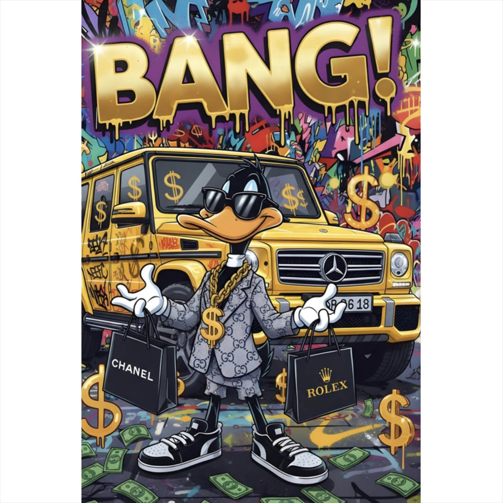 Dieses beeindruckende Wandbild vereint Elemente von Pop Art und modernem Stil, indem es eine ikonische Ente darstellt, die vor einem luxuriösen Auto posiert. Die Ente trägt auffällige Markenbekleidung und Accessoires, die sofort ins Auge springen und einen Hauch von Glamour und Luxus ausstrahlen. Umgeben von symbolträchtigen Logos und Geldscheinen erzeugt das Bild eine dynamische und lebendige Atmosphäre, die den Betrachter in eine Welt des Reichtums und der Opulenz entführt. Der Hintergrund ist mit Graffiti-Elementen und farbenfrohen Spritzern gestaltet, die der Szene Tiefe und Bewegung verleihen. Die Kombination aus bekannten Markensymbolen und urbanem Design macht dieses Bild zu einem echten Hingucker, der in jedem Raum ein modernes und trendiges Ambiente schafft. Die Darstellung spielt mit Humor und Extravaganz und ist ideal für Räume, die einen kreativen und modischen Akzent benötigen. Die Materialanmutung ist hochwertig und vermittelt eine hochwertige und edle Ausstrahlung. Dieses Kunstwerk ist perfekt für alle, die ein starkes Statement setzen möchten und ihren Raum mit einem einzigartigen und stilvollen Kunstwerk bereichern wollen.