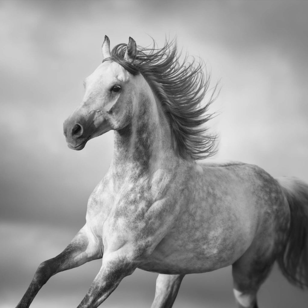 Dieses beeindruckende Wandbild zeigt ein majestätisches Pferd in voller Bewegung, eingefangen in einer hochwertigen Schwarz-Weiß-Fotografie. Das Motiv strahlt Dynamik und Eleganz aus, während das Pferd kraftvoll und frei über die Leinwand zu galoppieren scheint. Die grazilen Formen und die fließende Bewegung der Mähne verleihen dem Bild eine außergewöhnliche Tiefe und Ausdruckskraft. Der minimalistische Stil in Schwarz-Weiß hebt die Details des Tieres hervor und lässt es zum zentralen Blickfang in jedem Raum werden. Durch die kunstvolle Darstellung entsteht eine harmonische Atmosphäre, die sowohl beruhigend als auch inspirierend wirkt. Ideal geeignet für moderne Wohnräume, Büros oder Praxen, verleiht dieses Kunstwerk jedem Interieur eine stilvolle und zeitlose Note. Die feinen Linien und die perfekte Balance zwischen Licht und Schatten machen dieses Bild zu einem einzigartigen Dekorationsobjekt, das Naturverbundenheit und ästhetische Schönheit in Einklang bringt.