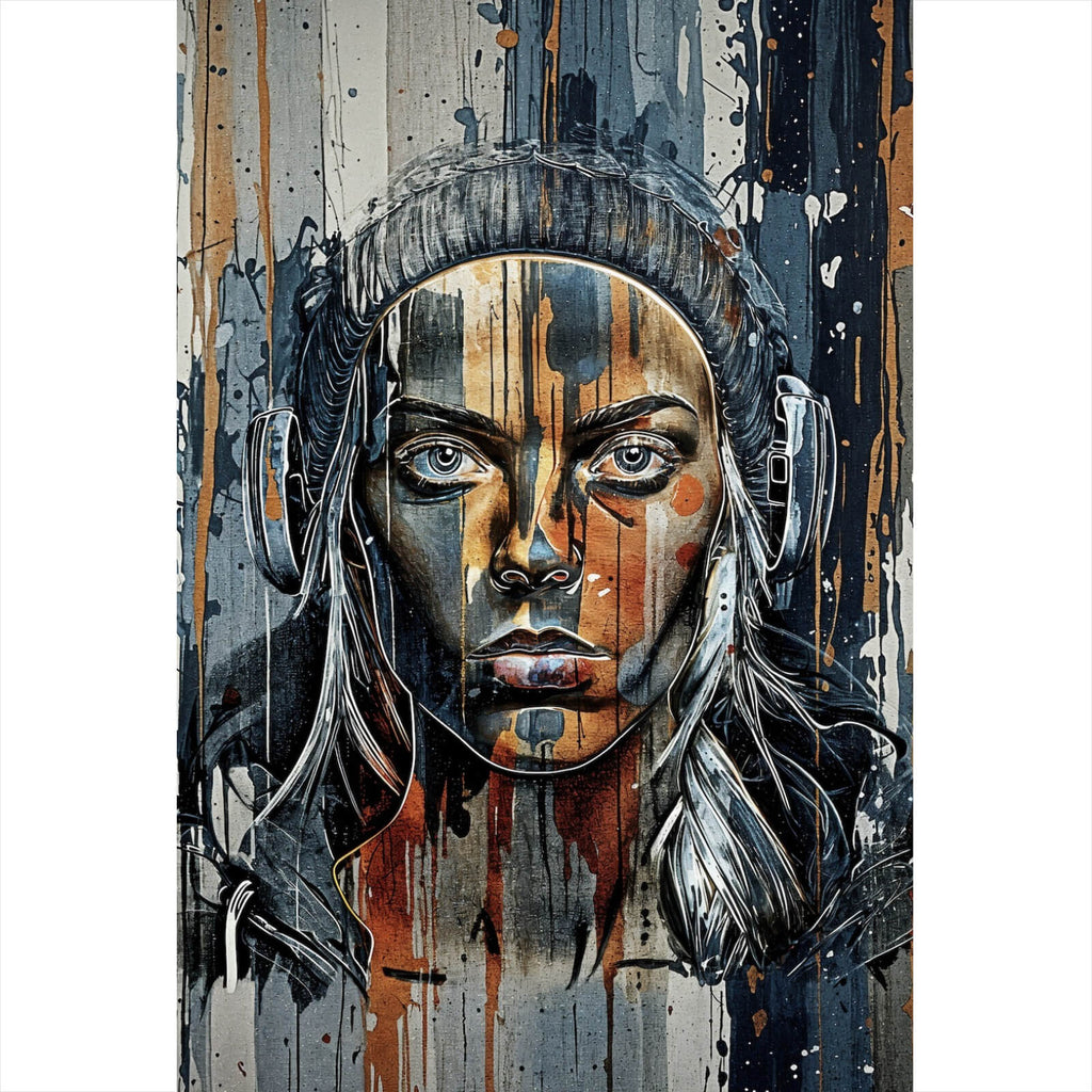 Diese beeindruckende Wandbild zeigt ein modernes, abstraktes Porträt einer Person mit Kopfhörern, das durch einen urbanen und zeitgenössischen Stil besticht. Die detaillierte Darstellung des Gesichts kombiniert mit den fließenden Linien und Tropfen, die sich über die gesamte Leinwand erstrecken, erzeugt eine dynamische und ausdrucksstarke Wirkung. Die Mischung aus verschiedenen Texturen und Stilen verleiht dem Bild eine besondere Tiefe und eine faszinierende Materialanmutung. Die Komposition wirkt sowohl kraftvoll als auch beruhigend und eignet sich ideal für moderne Wohnräume oder Büros, die eine kreative und stilvolle Atmosphäre fördern möchten. Das Bild zieht die Blicke auf sich und lädt den Betrachter ein, die Details und den Ausdruck des Porträts näher zu erkunden. Die künstlerische Kombination von Formen und Linien schafft ein einzigartiges visuelles Erlebnis, das perfekt in urbane und moderne Einrichtungskonzepte passt. Dieses Kunstwerk ist mehr als nur Dekoration; es ist ein Statement, das Individualität und kreativen Ausdruck in jedem Raum unterstreicht.
