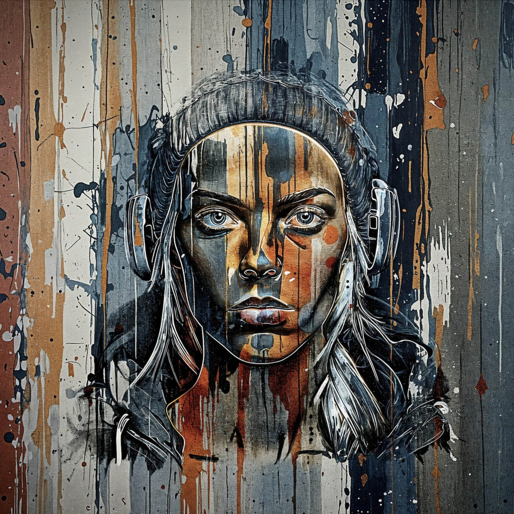 Diese beeindruckende Wandbild zeigt ein modernes, abstraktes Porträt einer Person mit Kopfhörern, das durch einen urbanen und zeitgenössischen Stil besticht. Die detaillierte Darstellung des Gesichts kombiniert mit den fließenden Linien und Tropfen, die sich über die gesamte Leinwand erstrecken, erzeugt eine dynamische und ausdrucksstarke Wirkung. Die Mischung aus verschiedenen Texturen und Stilen verleiht dem Bild eine besondere Tiefe und eine faszinierende Materialanmutung. Die Komposition wirkt sowohl kraftvoll als auch beruhigend und eignet sich ideal für moderne Wohnräume oder Büros, die eine kreative und stilvolle Atmosphäre fördern möchten. Das Bild zieht die Blicke auf sich und lädt den Betrachter ein, die Details und den Ausdruck des Porträts näher zu erkunden. Die künstlerische Kombination von Formen und Linien schafft ein einzigartiges visuelles Erlebnis, das perfekt in urbane und moderne Einrichtungskonzepte passt. Dieses Kunstwerk ist mehr als nur Dekoration; es ist ein Statement, das Individualität und kreativen Ausdruck in jedem Raum unterstreicht.