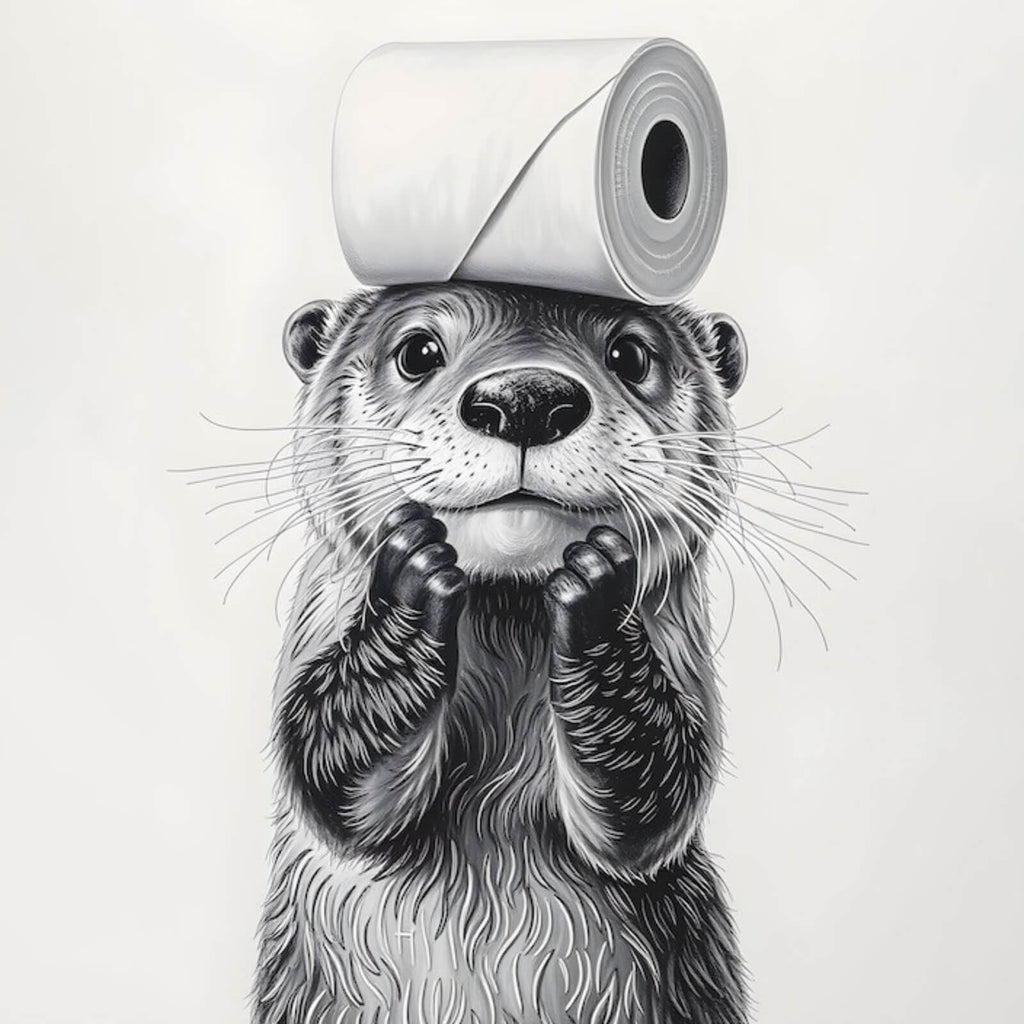 Auf dem Bild ist eine bezaubernde Zeichnung eines Otters zu sehen, der auf humorvolle Weise eine Rolle Toilettenpapier auf dem Kopf balanciert. Der Otter ist in einem monochromen Schwarz-Weiß-Stil illustriert, was der Darstellung einen klassischen und stilvollen Look verleiht. Seine großen, neugierigen Augen und die leicht hochgezogenen Pfoten lassen ihn besonders niedlich und verspielt erscheinen. Die Details in seinem Fell sind sorgfältig ausgearbeitet, wodurch der Otter lebendig und realistisch wirkt. Das Toilettenpapier, das untypisch auf dem Kopf des Tieres platziert ist, fügt dem Bild eine humorvolle Note hinzu, die den Betrachter zum Schmunzeln bringt. Die gesamte Komposition ist minimalistisch gehalten, mit einem glatten, hellen Hintergrund, der den Fokus vollständig auf den charmanten Otter lenkt. Diese Illustration eignet sich hervorragend als dekoratives Element in einem modernen Raum oder als Teil einer humorvollen Kunstsammlung. Sie spricht Tierliebhaber und Kunstfreunde gleichermaßen an und vermittelt eine fröhliche, unbeschwerte Stimmung.