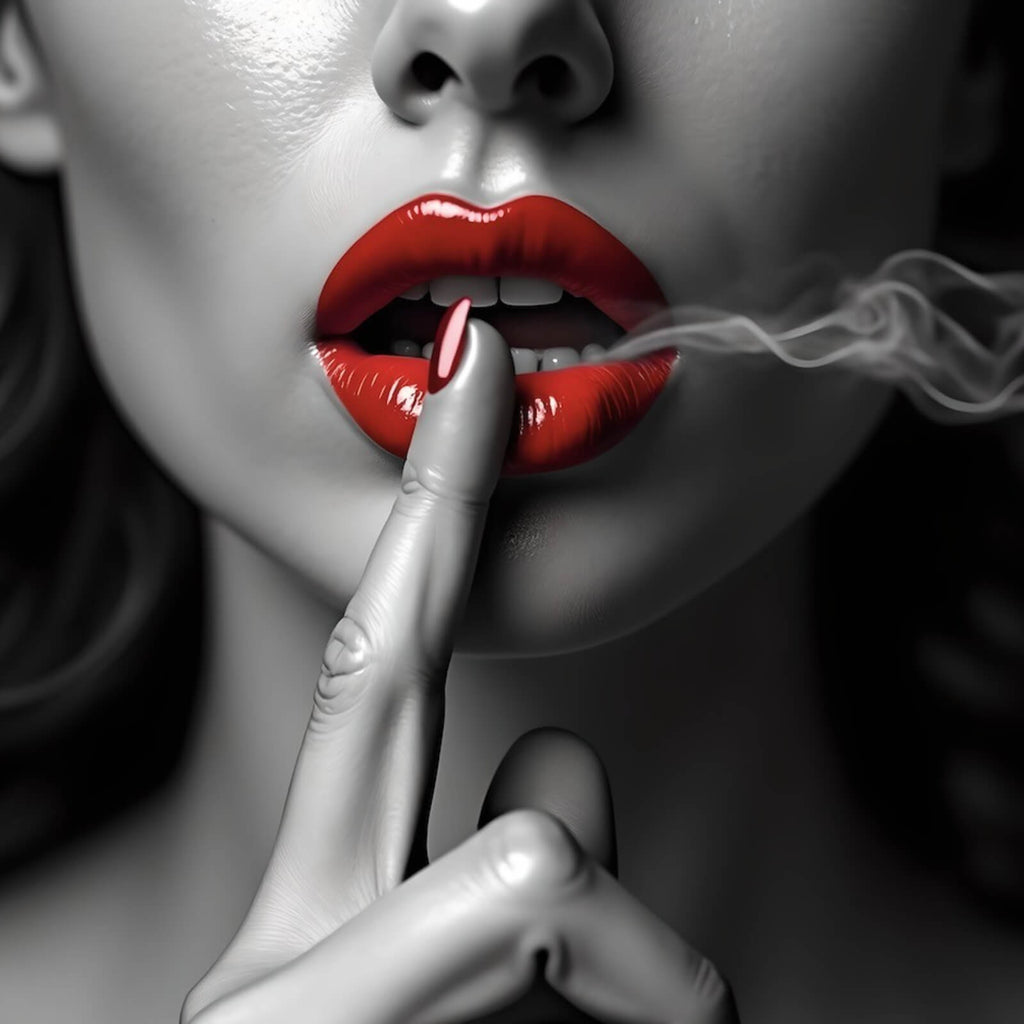 Das Bild zeigt eine stilisierte Nahaufnahme eines Gesichts im Schwarz-Weiß-Stil mit dramatisch roten Akzenten auf den Lippen und den Fingernägeln. Die Person im Bild legt ihren Zeigefinger auf die Lippen in einer typischen "Pssst"-Geste, was eine geheimnisvolle und stille Atmosphäre schafft. Ein dünner Rauchschwaden steigt aus ihrem Mund auf, was dem Bild eine zusätzliche Ebene von Dramatik und Sinnlichkeit verleiht. Die glänzend roten Lippen bilden einen starken Kontrast zum monochromen Hintergrund und ziehen sofort die Aufmerksamkeit auf sich. Die Haut und der Finger sind in einem weichen Grauton gehalten, was die roten Akzente noch stärker hervorhebt. Diese Komposition vermittelt ein Gefühl von Eleganz und Verführung, während die rauchigen Elemente dem Bild einen Hauch von Mystik verleihen. Solche Bilder werden oft in der Kunstfotografie verwendet, um Emotionen und Stil zu vermitteln, und sind ideal für Kampagnen, die auf Glamour und Geheimnis abzielen. Die Gesamtästhetik ist sowohl modern als auch klassisch, was sie vielseitig einsetzbar macht.