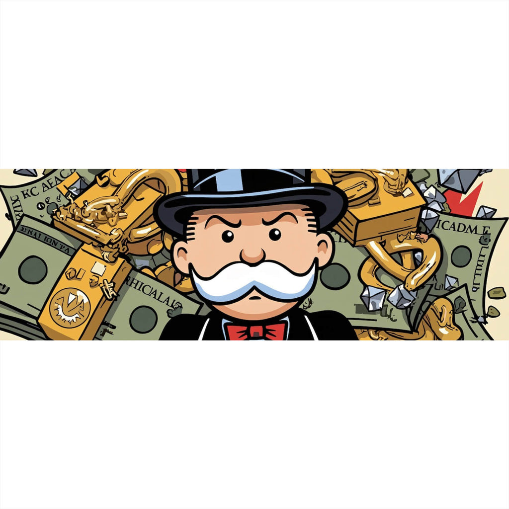 Dieses beeindruckende Wandbild zeigt eine ikonische Figur, die mit ihrem markanten Zylinder und Schnurrbart inmitten von Geldscheinen und Diamanten dargestellt ist. Das Motiv vermittelt ein starkes Gefühl von Reichtum und Wohlstand, das sowohl inspirierend als auch provokant wirken kann. Die Darstellung ist im Pop Art Stil gehalten, was dem Bild eine moderne und dynamische Note verleiht. Die Verwendung von klaren Linien und kräftigen Formen sorgt für eine ausdrucksstarke Optik, die in jedem Raum zum Blickfang wird. Die Kombination aus der bekannten Figur und den Symbolen für Geld und Luxus spricht Themen wie Erfolg, Geschäftssinn und finanzielle Freiheit an. Dieses Kunstwerk eignet sich hervorragend als dekoratives Element in Räumen, die ein Gefühl von Prestige und Inspiration ausstrahlen sollen, wie etwa in Büros oder Wohnzimmern. Es kann auch in einer Bar oder gastronomischen Einrichtung eingesetzt werden, um eine Atmosphäre von Eleganz und Exklusivität zu schaffen. Die Materialanmutung des Bildes lässt auf eine hochwertige Drucktechnik schließen, die die Details und die Tiefe des Motivs optimal zur Geltung bringt. Das Bild wirkt durch seine Komposition und die symbolischen Elemente motivierend und könnte als tägliche Inspiration für den eigenen Erfolg dienen.